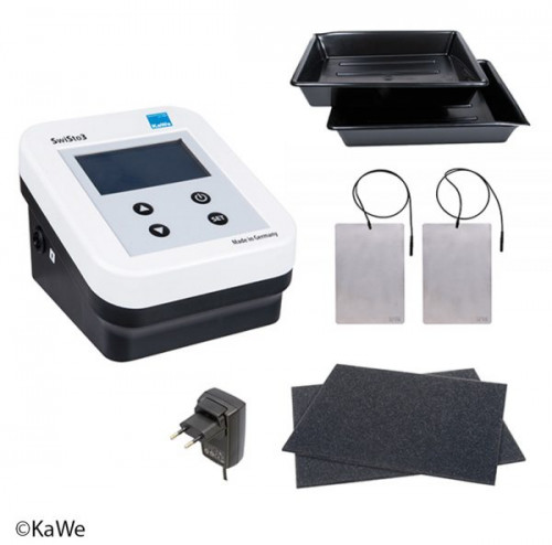 SwiSto3 -setin hinta sisältää iontoforeesilaitteen, latauslaitteen, kaksi allasta, kaksi elektrodia ja kaksi vaahtomuovityynyä.